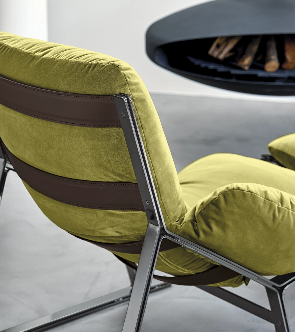 Scaunul devine un dialog între oximoron și simplitate sobră. Structura metalică susține perne realizate inteligent, cusute manual și finisate cu grijă, într-o construcție care creează impresia de plutire. Designul invită la observare și la un moment de contemplare, înainte de a descoperi, firesc, cât de ușor este să te simți în largul tău în prezența sa.
