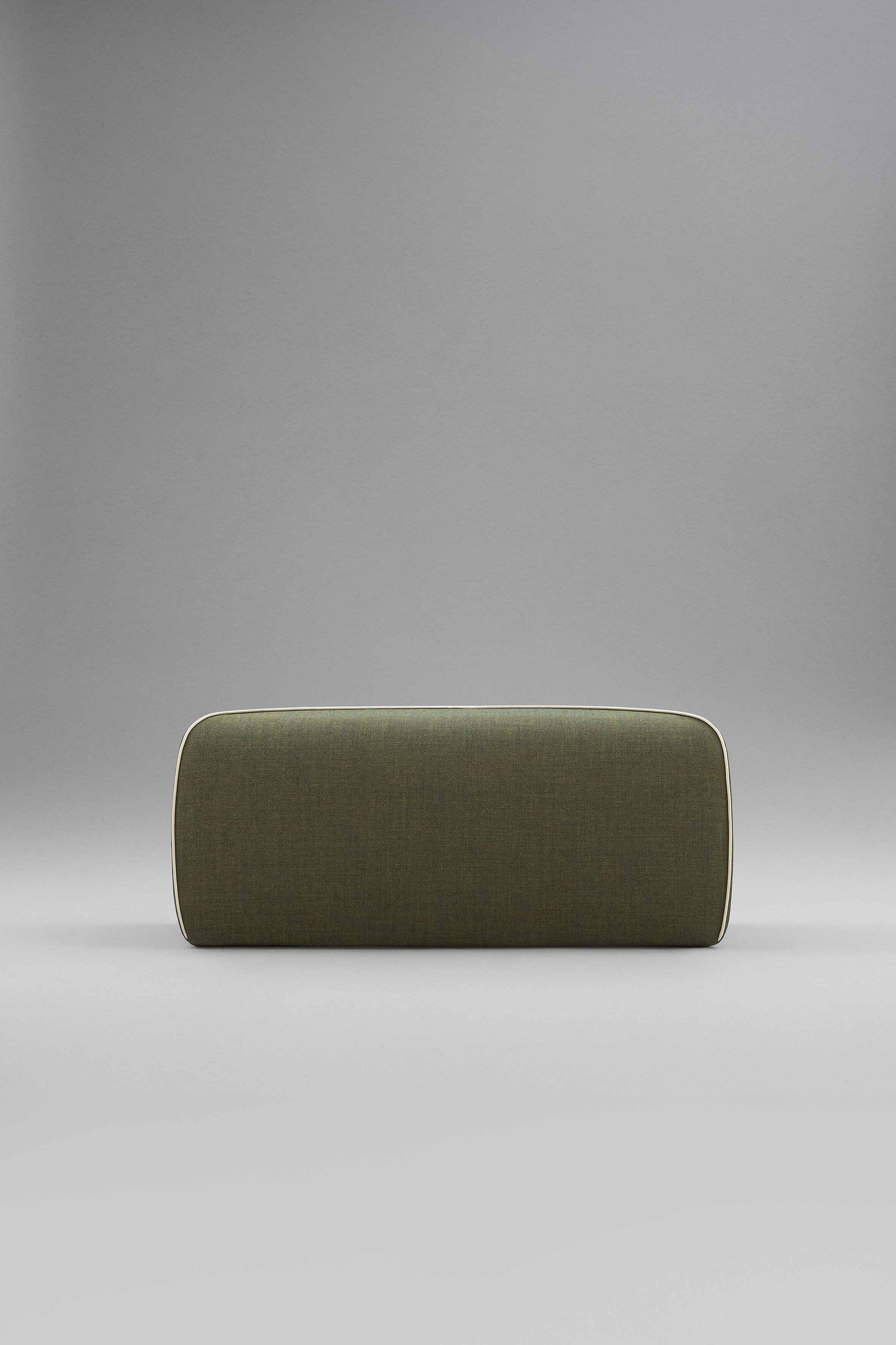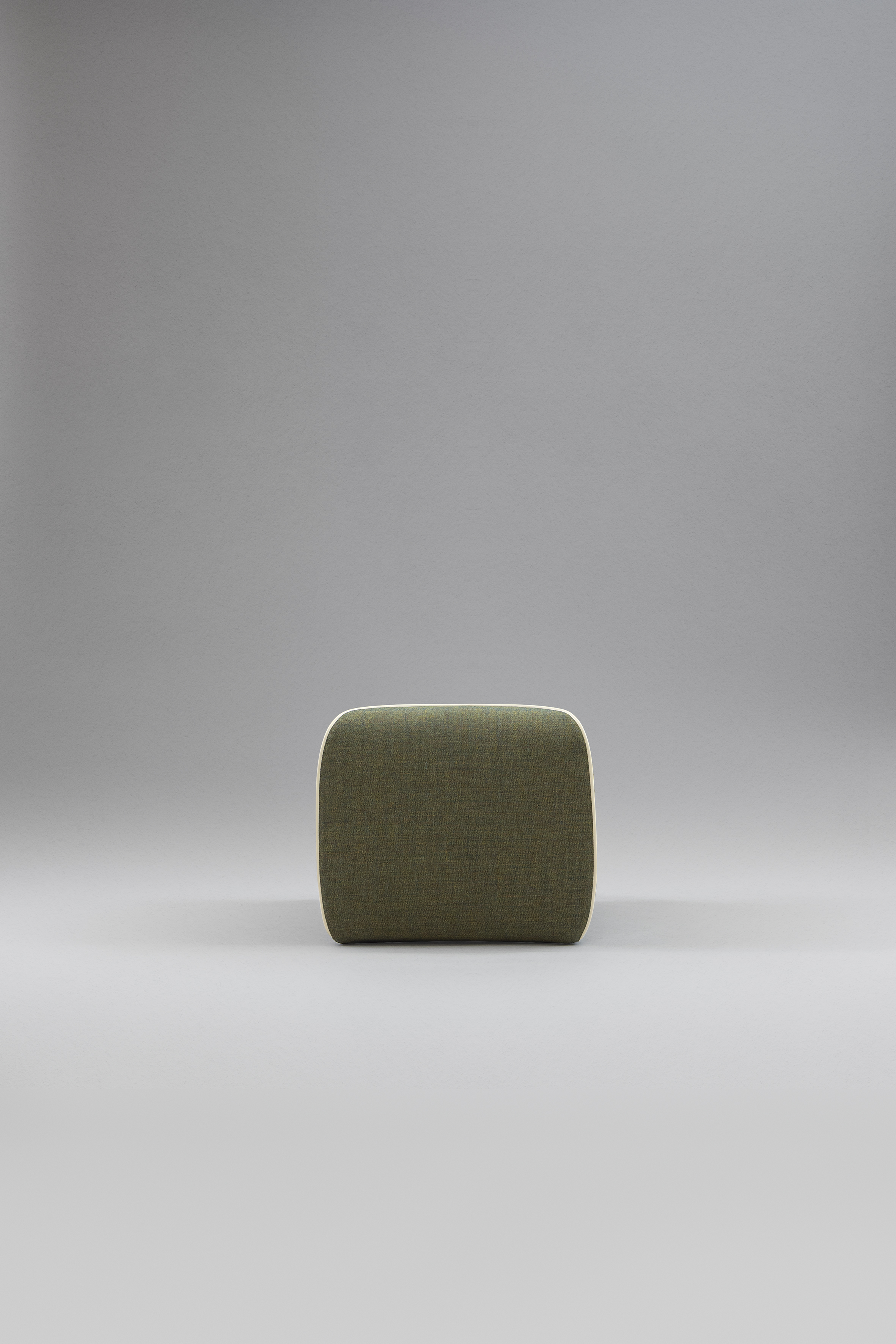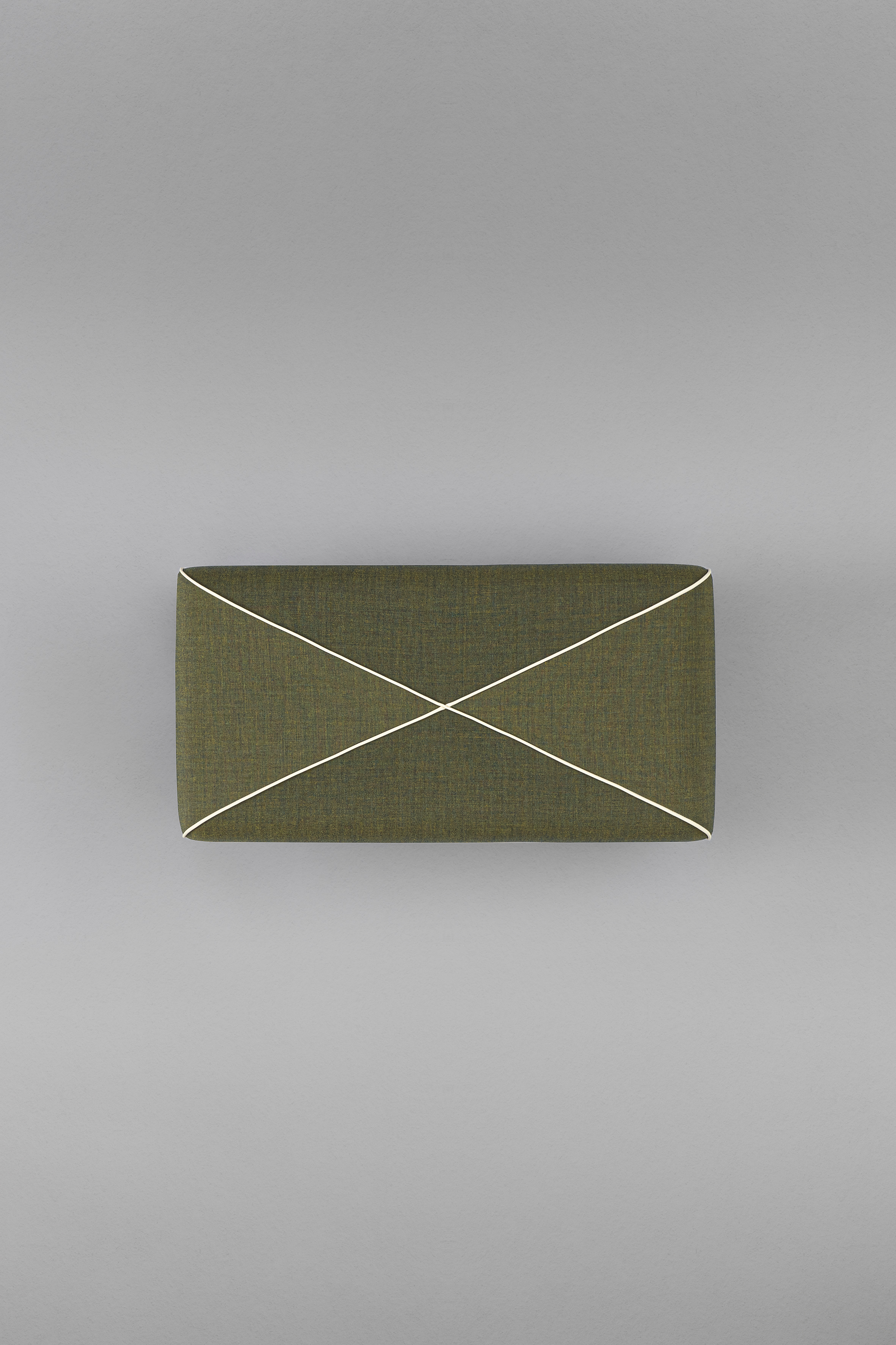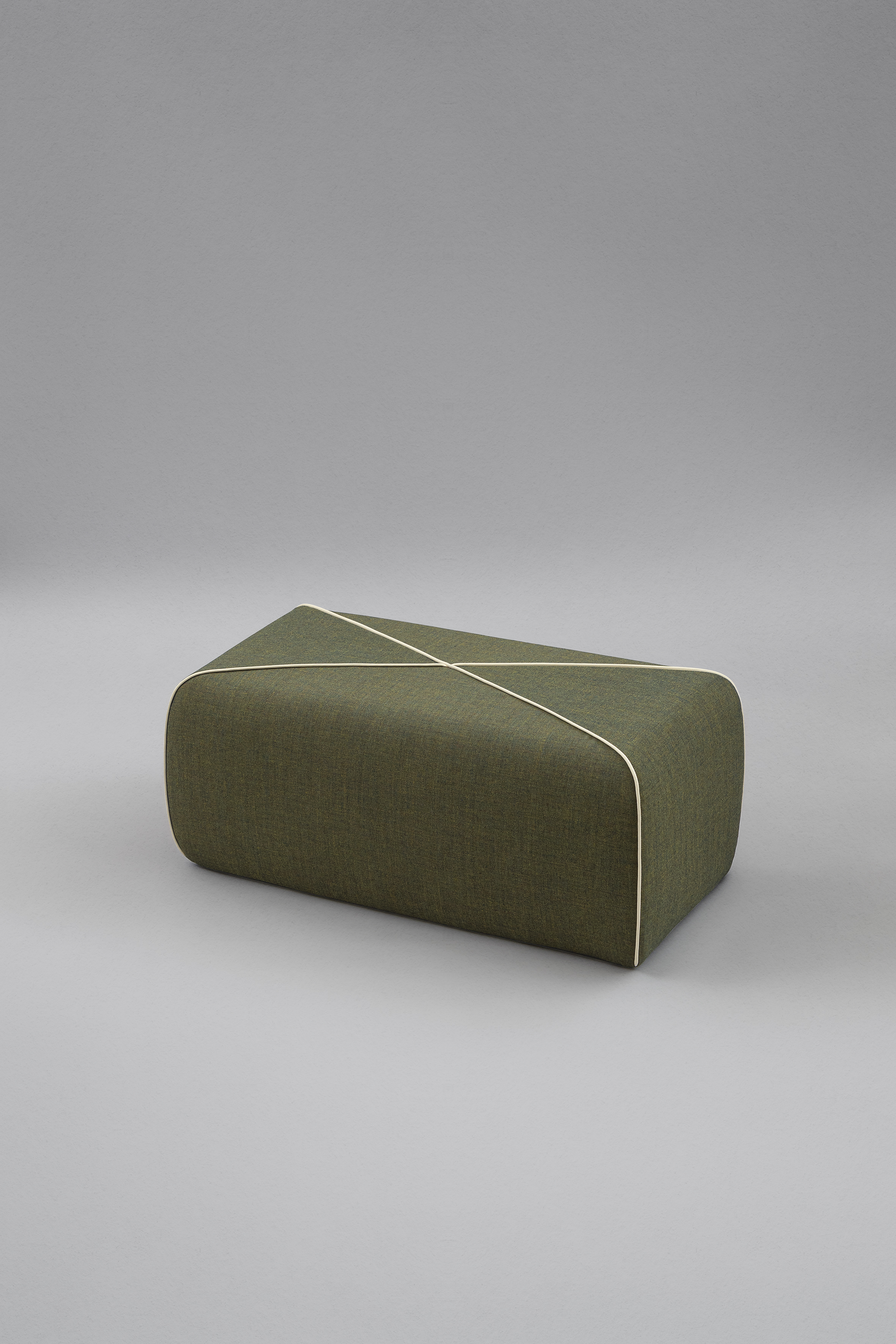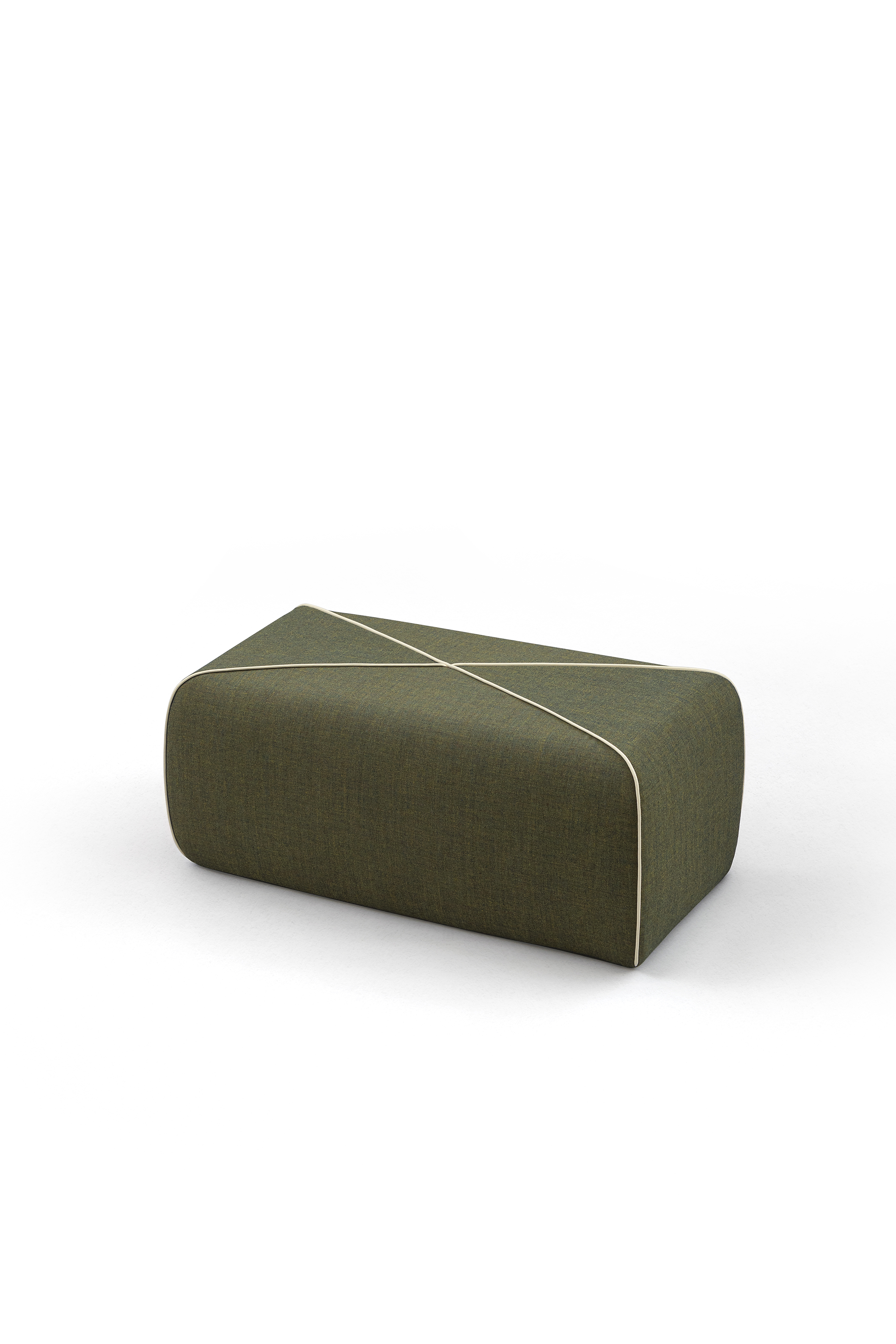 Puf moale, tapițat, cu cusături încrucișate contrastante, disponibil în două versiuni, cu bază pătrată sau dreptunghiulară.