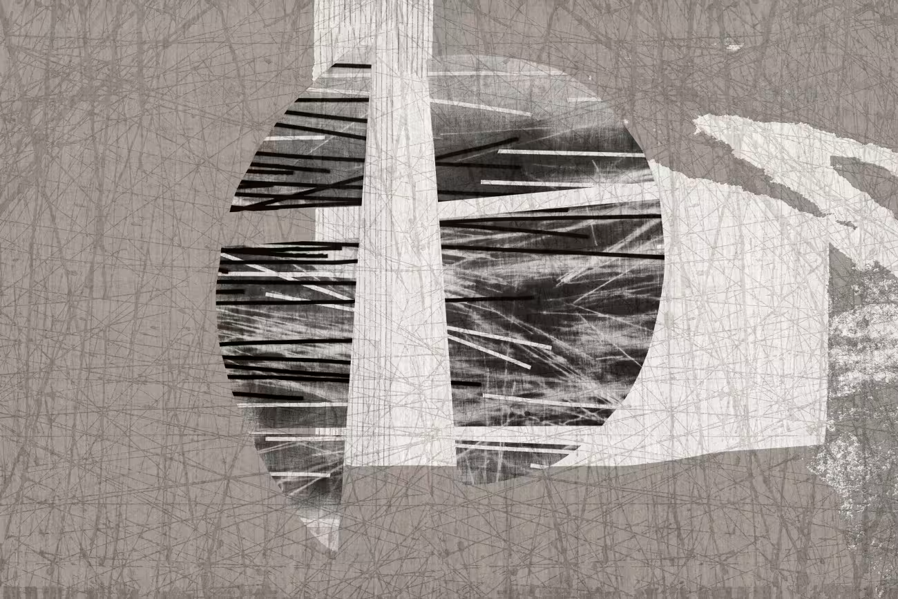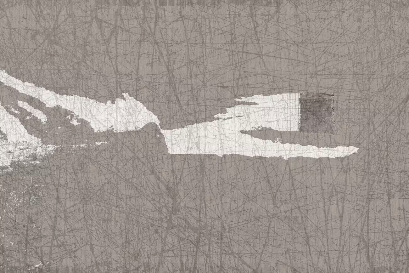 Linii subțiri străbat o suprafață încărcată de tensiune, asemenea crăpăturilor din pământ după o ploaie bruscă. Curbele apar cu forță, evocând amintirea urmelor de pași săpate în solul acum uscat, într-un dialog continuu între profunzime și suprafață.