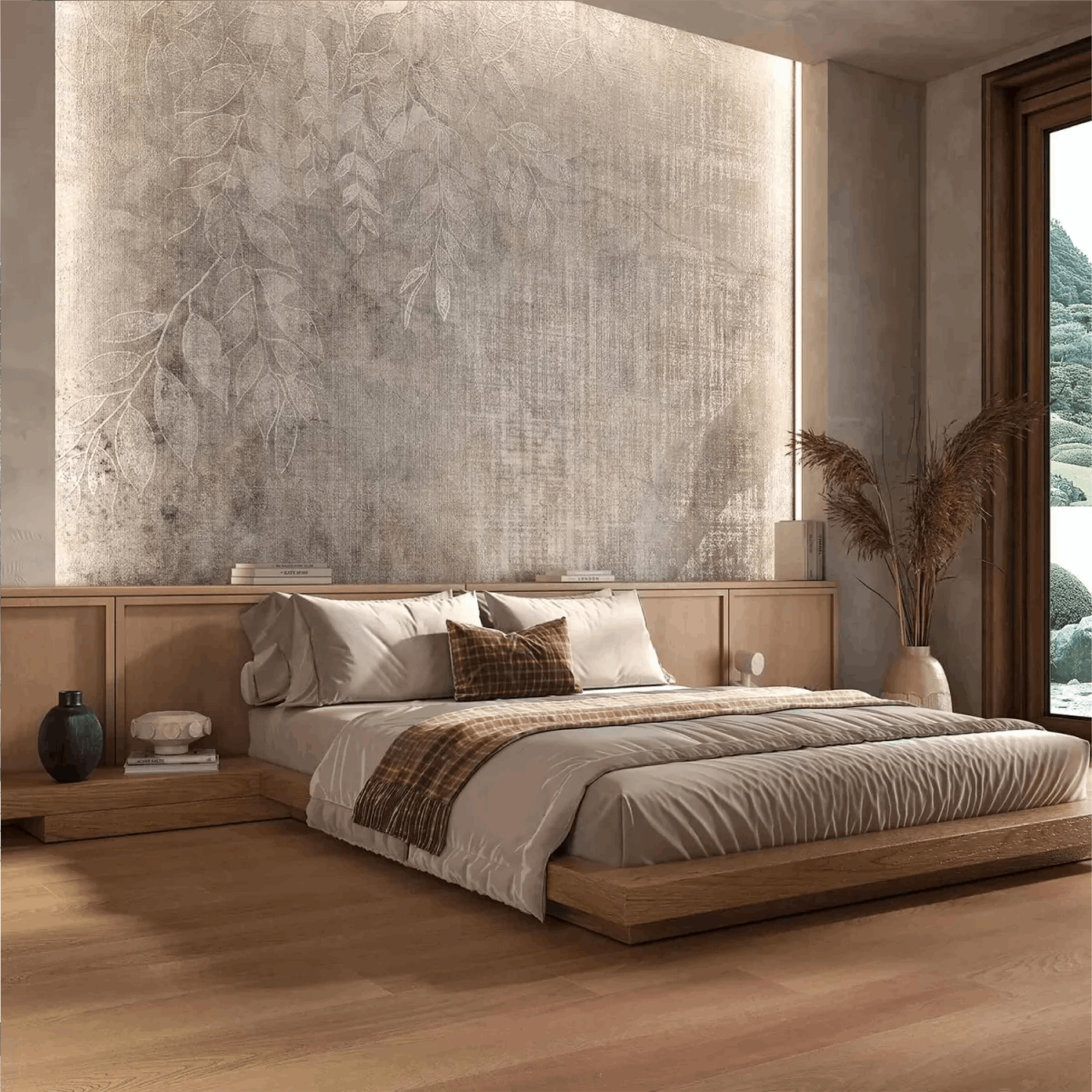 Tapetul Feywood din colecția Metal Plus de la Tecnografica este o reinterpretare sofisticată a naturii, în care motivele botanice sunt elevate printr-un finisaj metalic rafinat. Frunzele delicate par să plutească peste un fundal texturat, creând o compoziție calmă, dar profund expresivă.