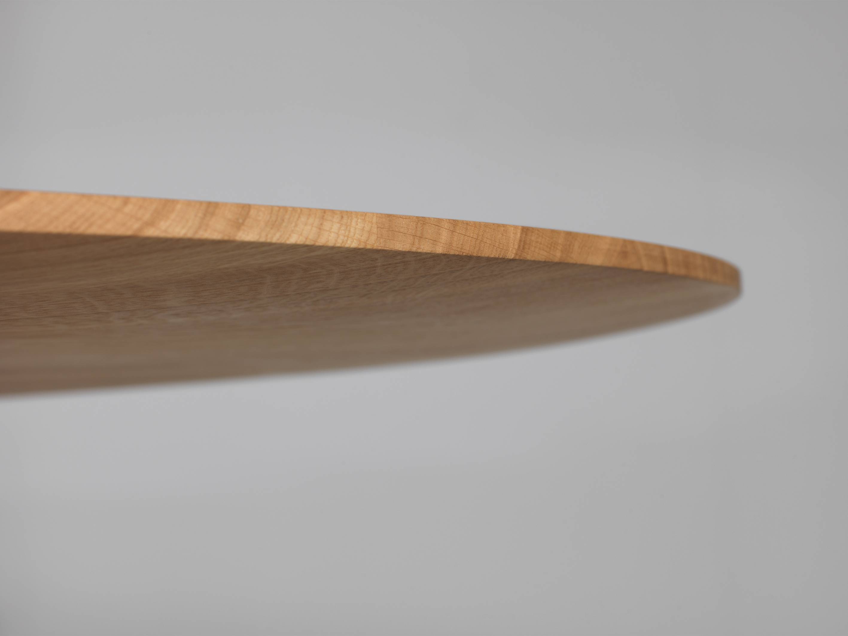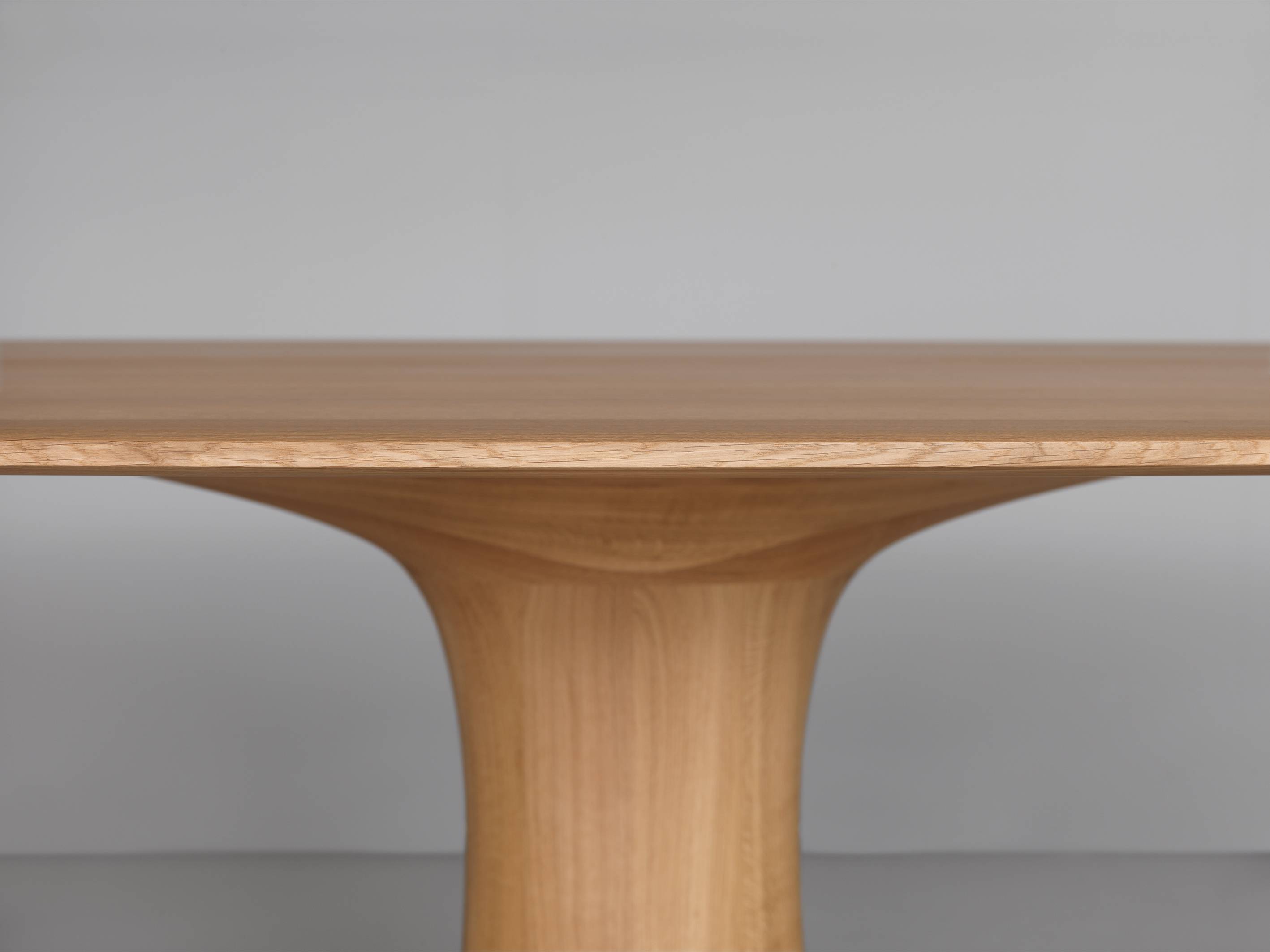 Blatul mesei, baza centrală și placa de sprijin de la nivelul podelei au toate formă ovală. Această geometrie necesită un nivel foarte ridicat de măiestrie în prelucrare și este unică în varianta realizată din lemn masiv.