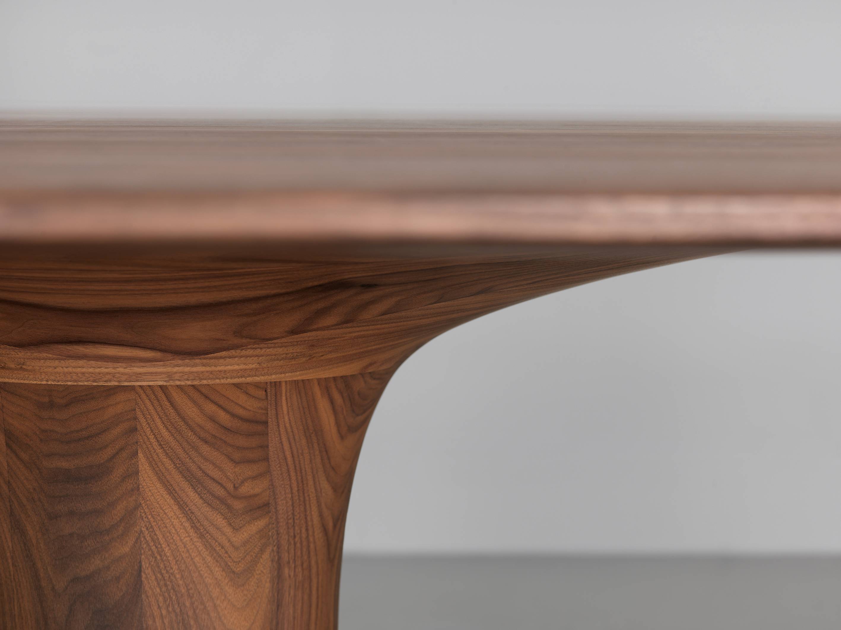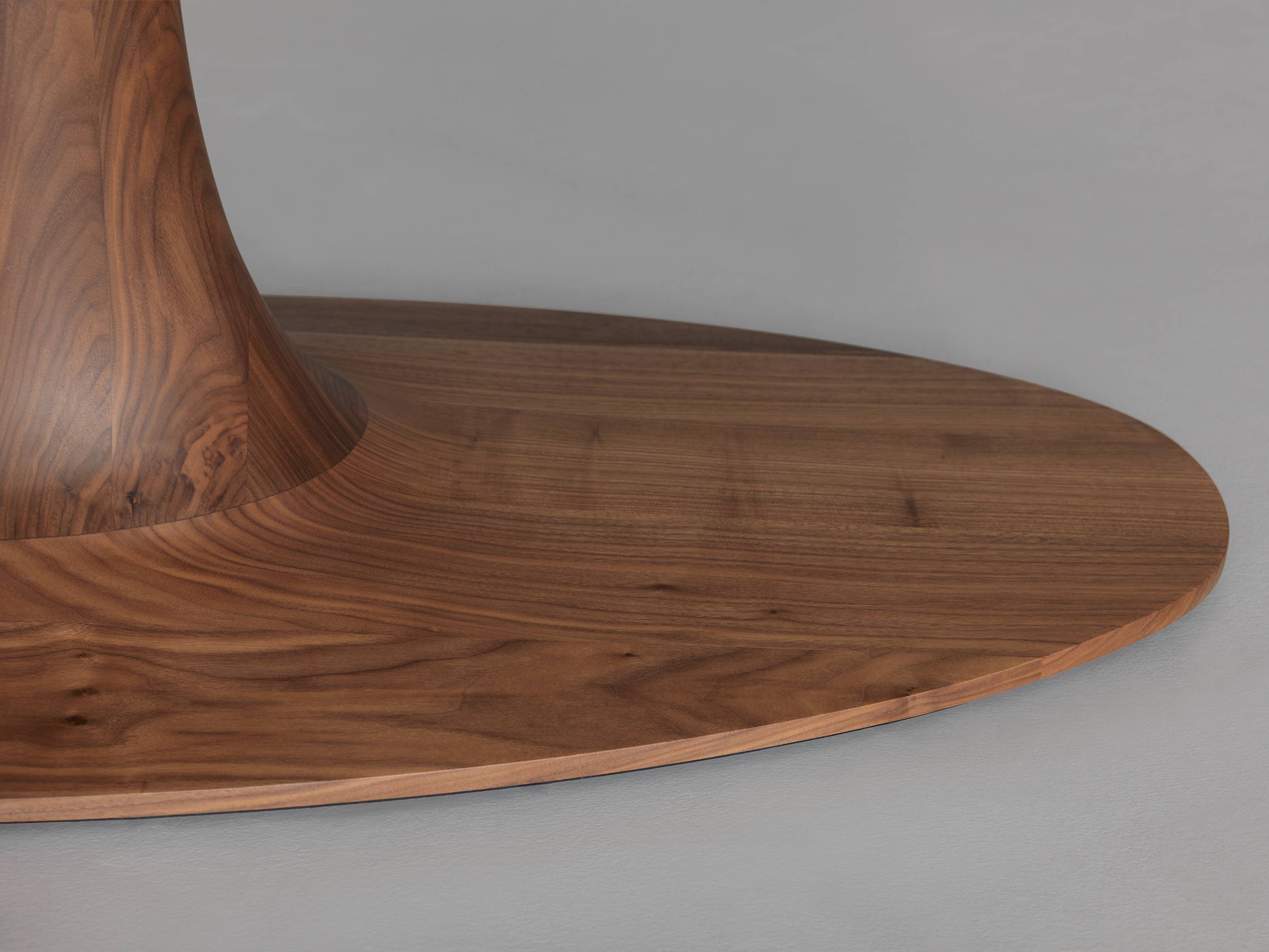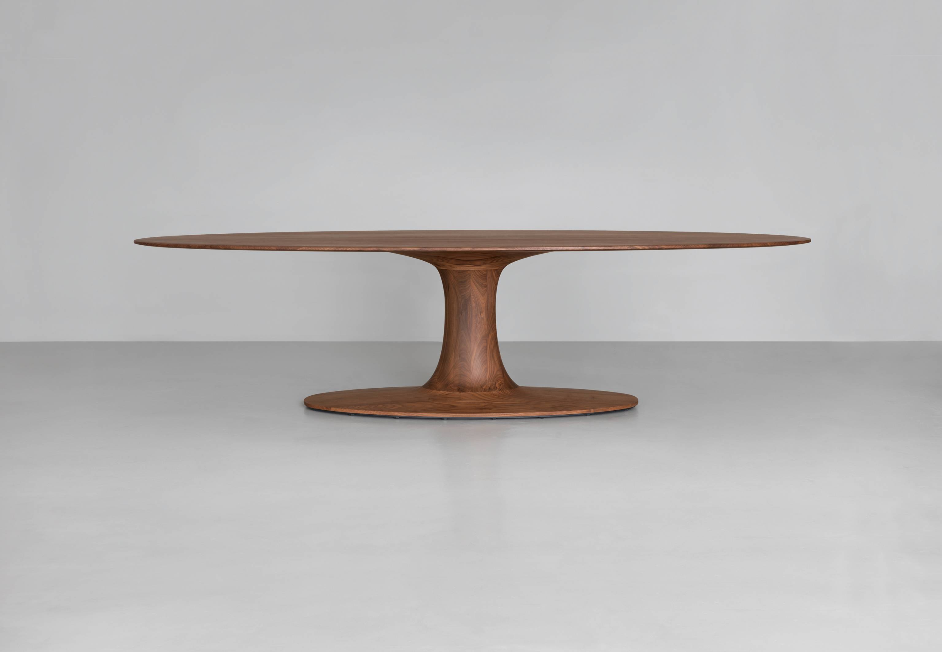 Blatul mesei, baza centrală și placa de sprijin de la nivelul podelei au toate formă ovală. Această geometrie necesită un nivel foarte ridicat de măiestrie în prelucrare și este unică în varianta realizată din lemn masiv.