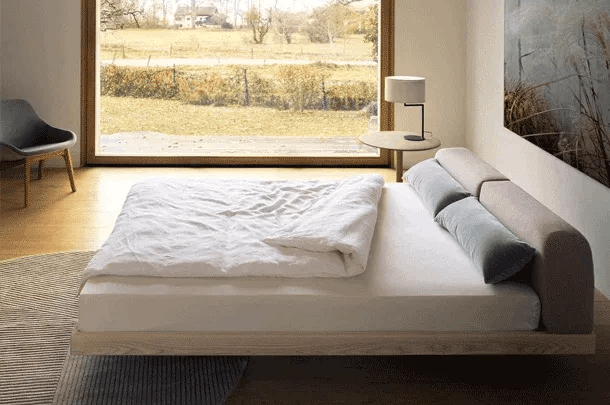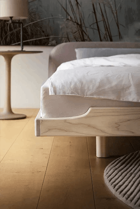 Raza continuă a muchiilor evidențiază frumusețea lemnului masiv și creează o senzație plăcută la atingere, aproape moale. Pernele tapițate oferă confort atât pentru citit în poziție culcată, cât și ca spătar stabil în poziție șezut.